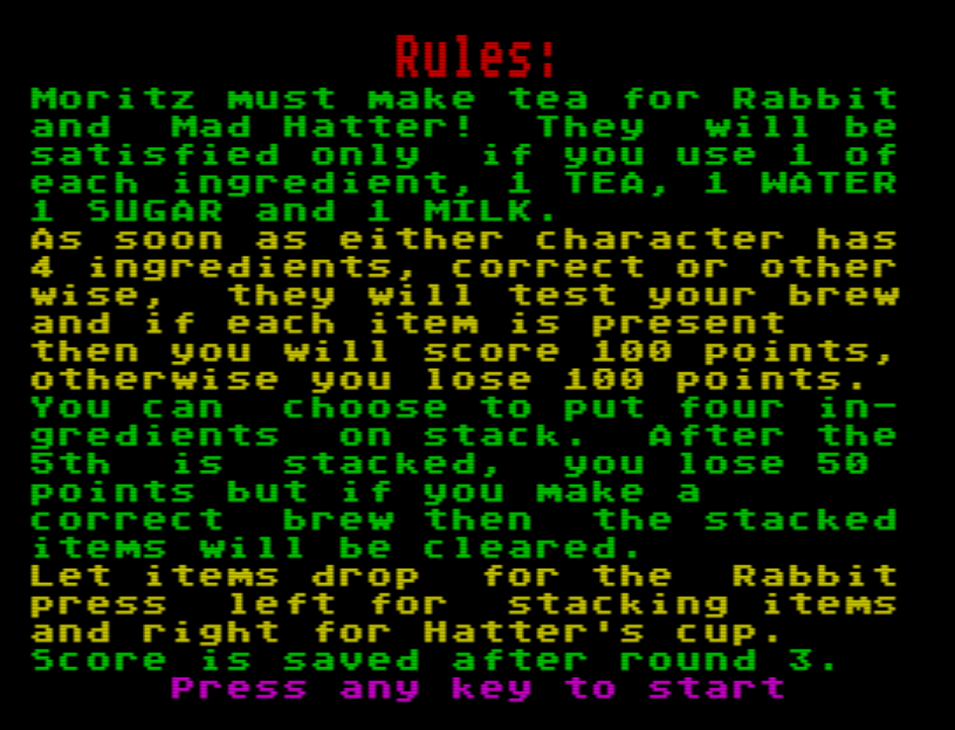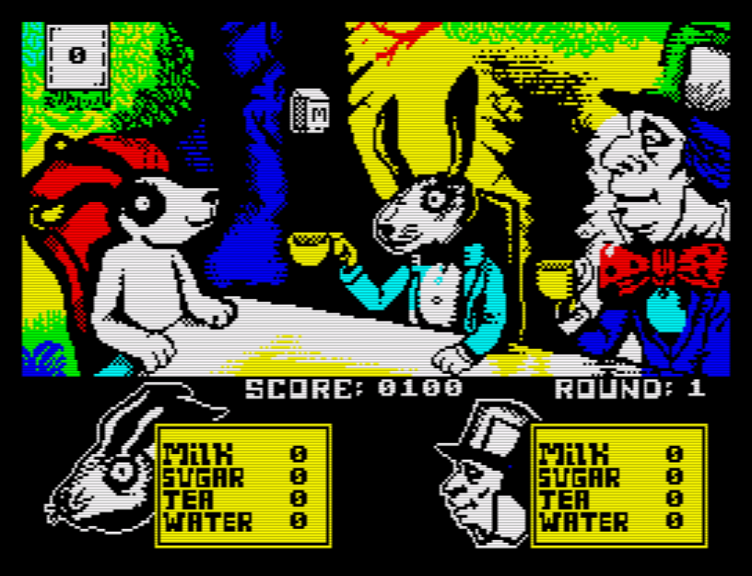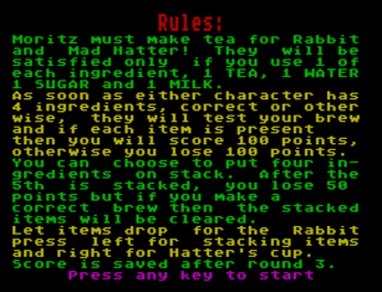 Have fun with the ZX Spectrum version. Help Moritz to make the Tea Party a success pleasing the White Rabbit and the Mad Hatter.